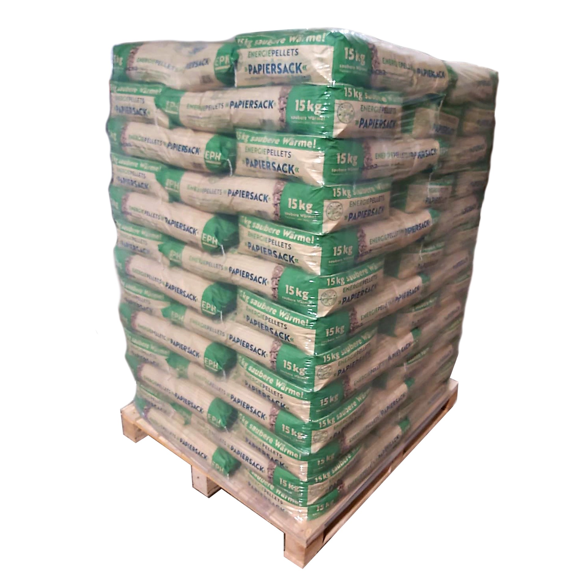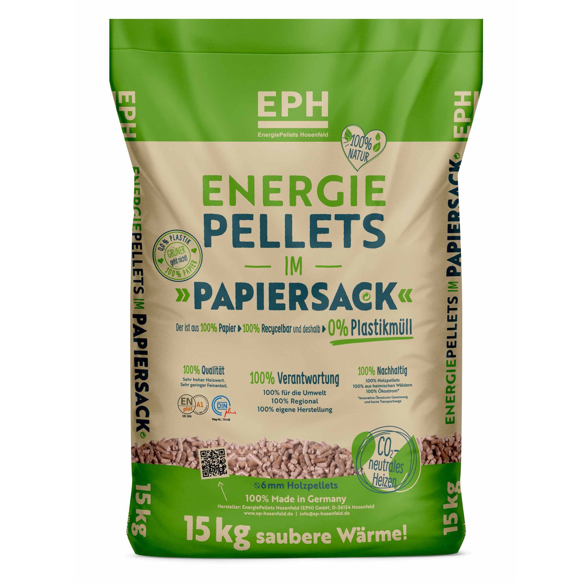 ENplus A1 Holzpellets Ø 6 mm im Papiersack: 65 × 15 kg (975 kg). Deutsche Produktion, 100 % Nadelholz, effizient, sauber, plastikfrei verpackt.