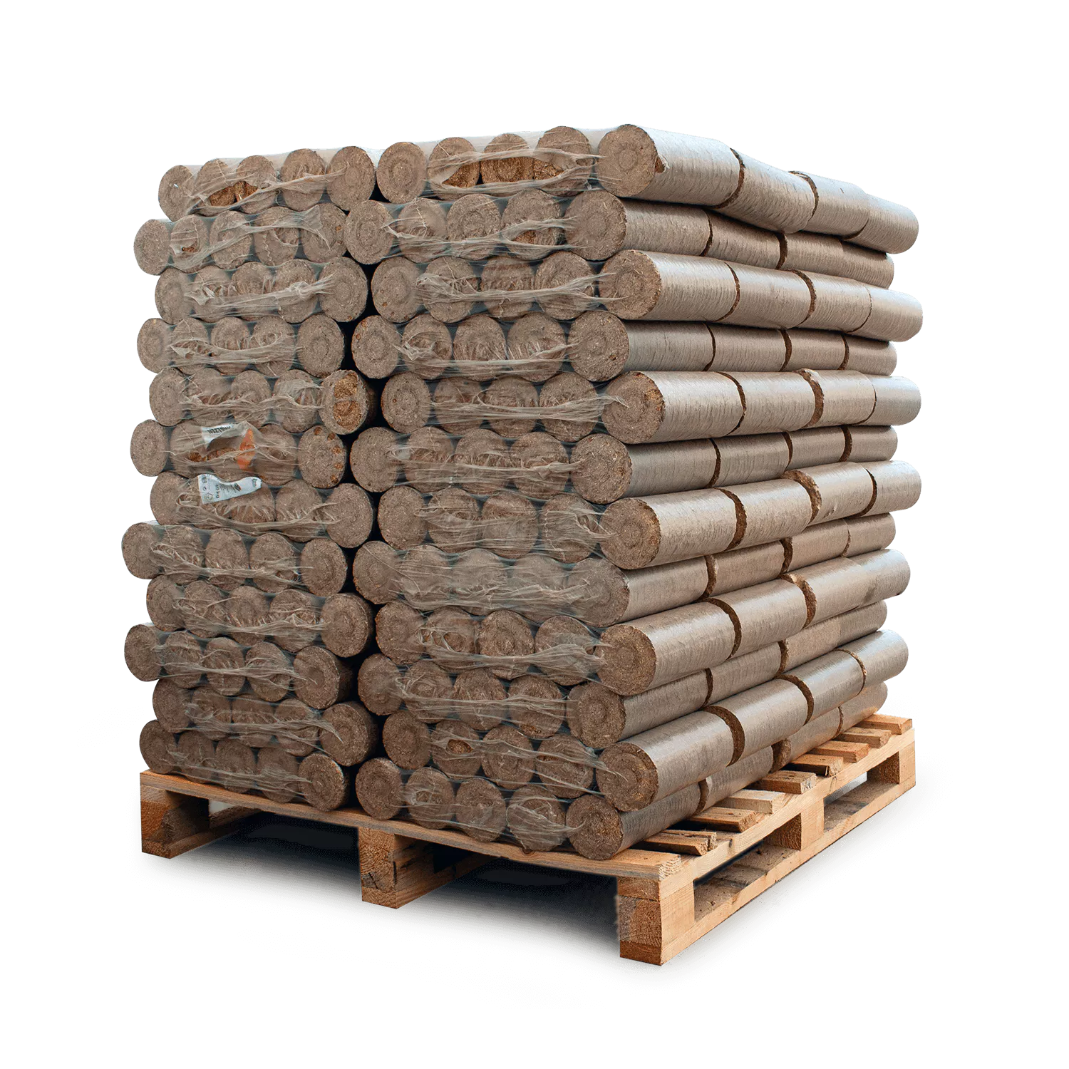 Die Briketts werden palettiert per Spedition geliefert. Ein Paket wiegt 10 kg; eine Palette enthält 96 Pakete = 960 kg. Runde Form ohne Loch; leicht stapel- und lagerbar.