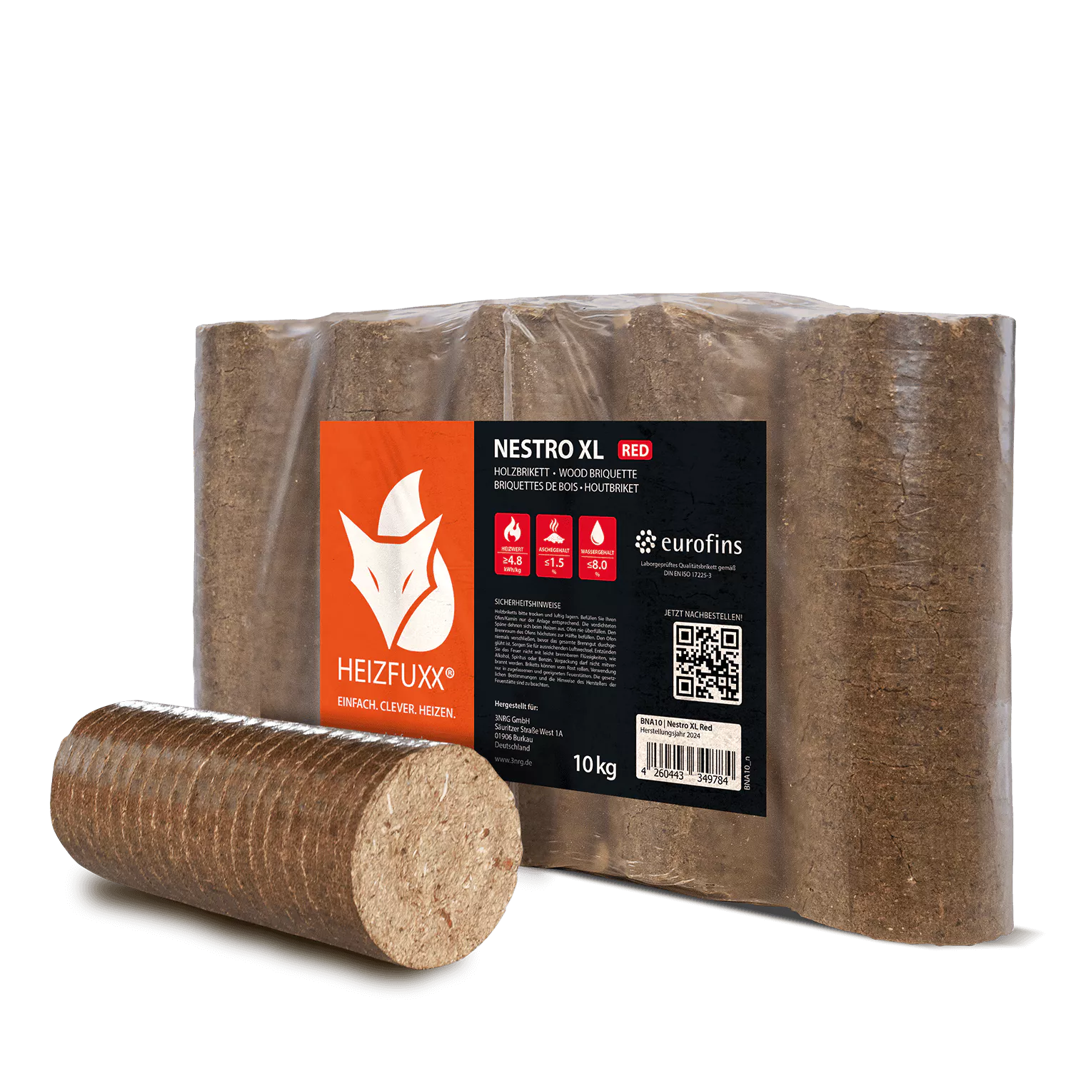 Nestro XL Red Holzbriketts aus Hartholz, laborgeprüft nach DIN EN ISO 17225-3 (A1). Heizwert ≥ 4,8 kWh/kg, Restfeuchte ≤ 8 %, Asche ≤ 1,5 %. Runde Form ohne Loch, leicht zu brechen. Palette mit 96 × 10 kg = 960 kg. Konstante Wärme & sauberes Abbrennen.