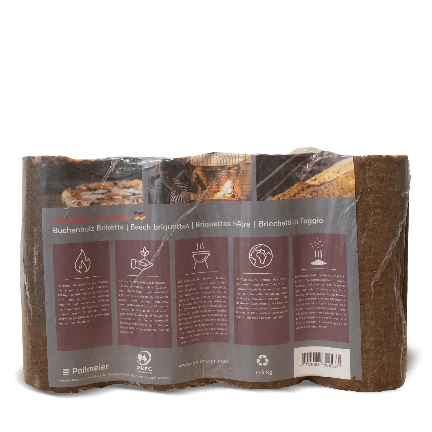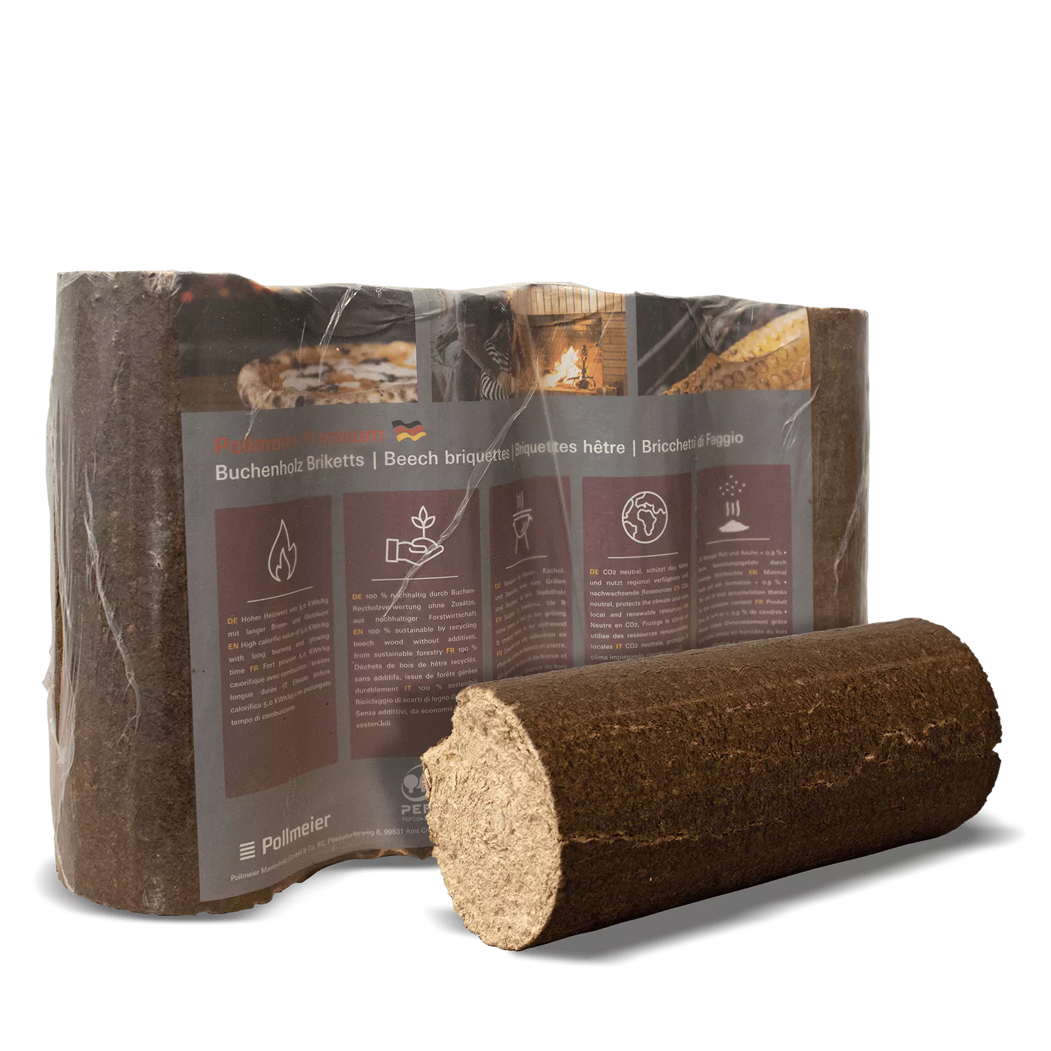 Pollmeier Buchen-Holzbriketts (Nestro, rund ohne Loch): sofort ofenfertig, hoher Heizwert & stabile Glut. Eurofins-geprüft nach DIN EN ISO 17225-3. Paket 6 kg, Palette 160 × 6 kg = 960 kg.