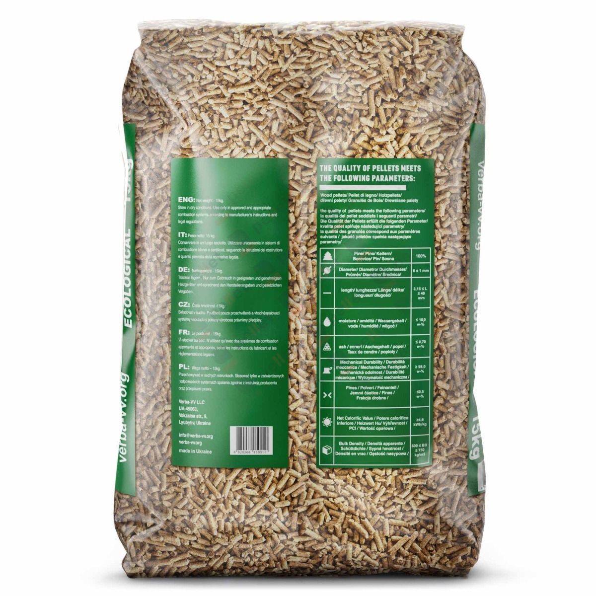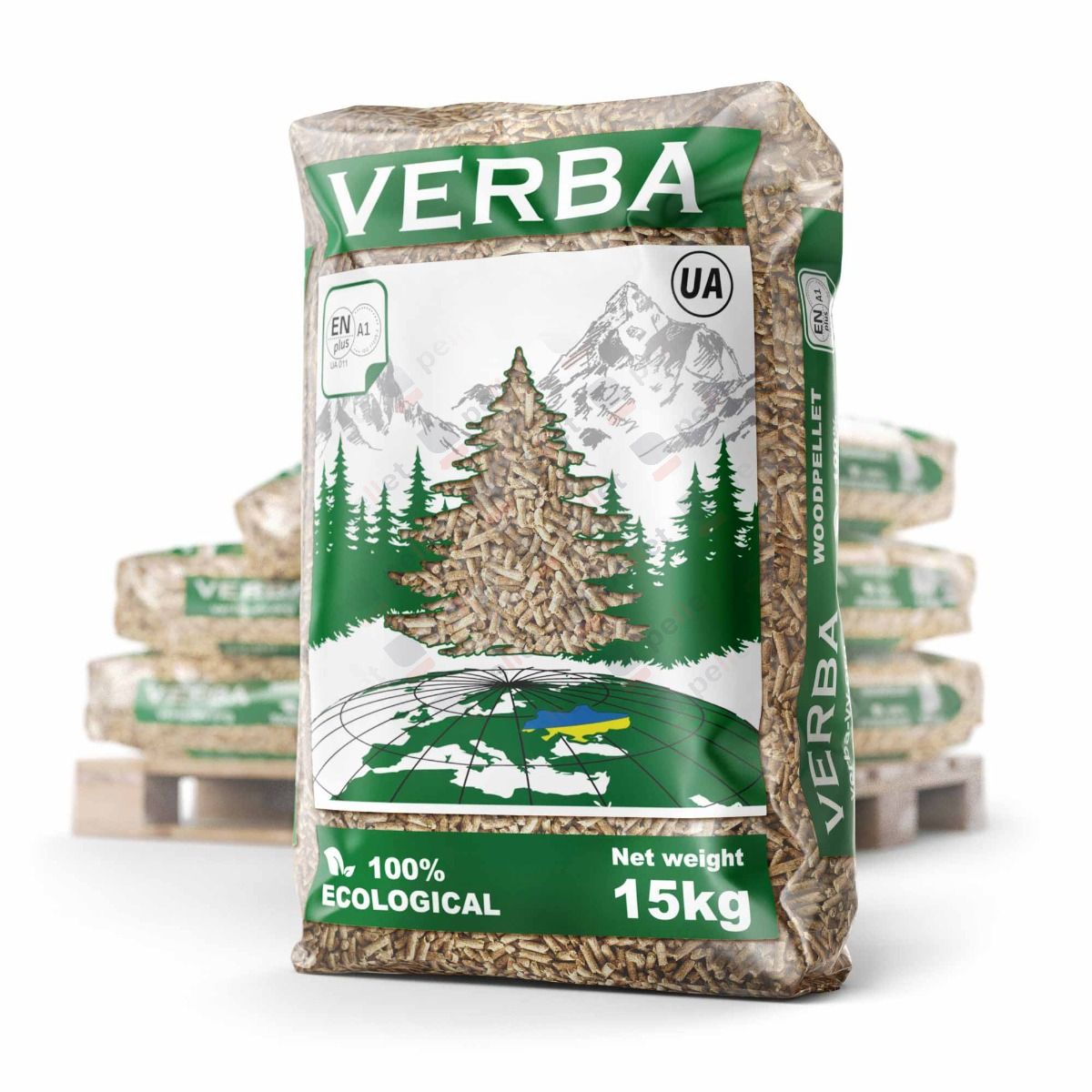 Holzpellets VERBA ENplus® A1 (Zertifikat UA011) aus Nadelholz (Kiefer, Fichte) ohne Zusatzstoffe. Heizwert ≥ 4,90 kWh/kg (≥ 17,70 MJ/kg), Aschegehalt ≤ 0,50 %, Feuchtigkeit ≤ 7,10 %, Durchmesser 6 mm.